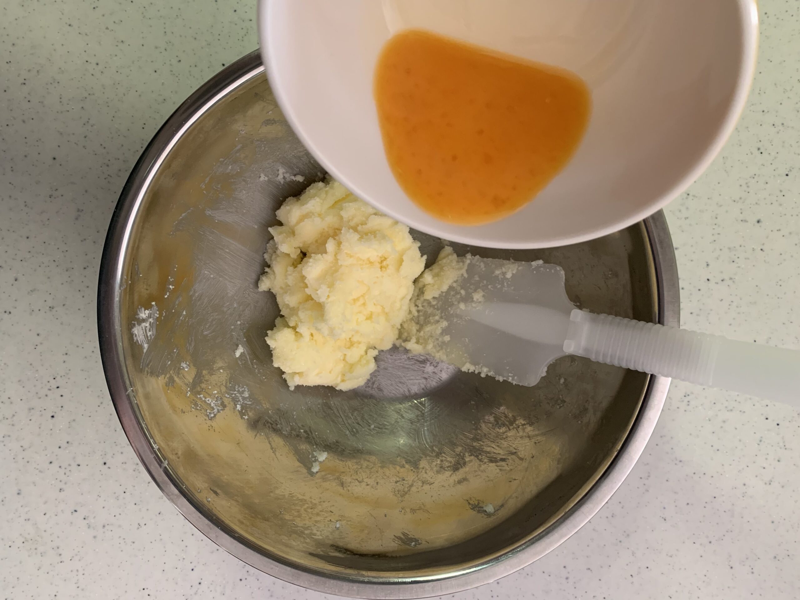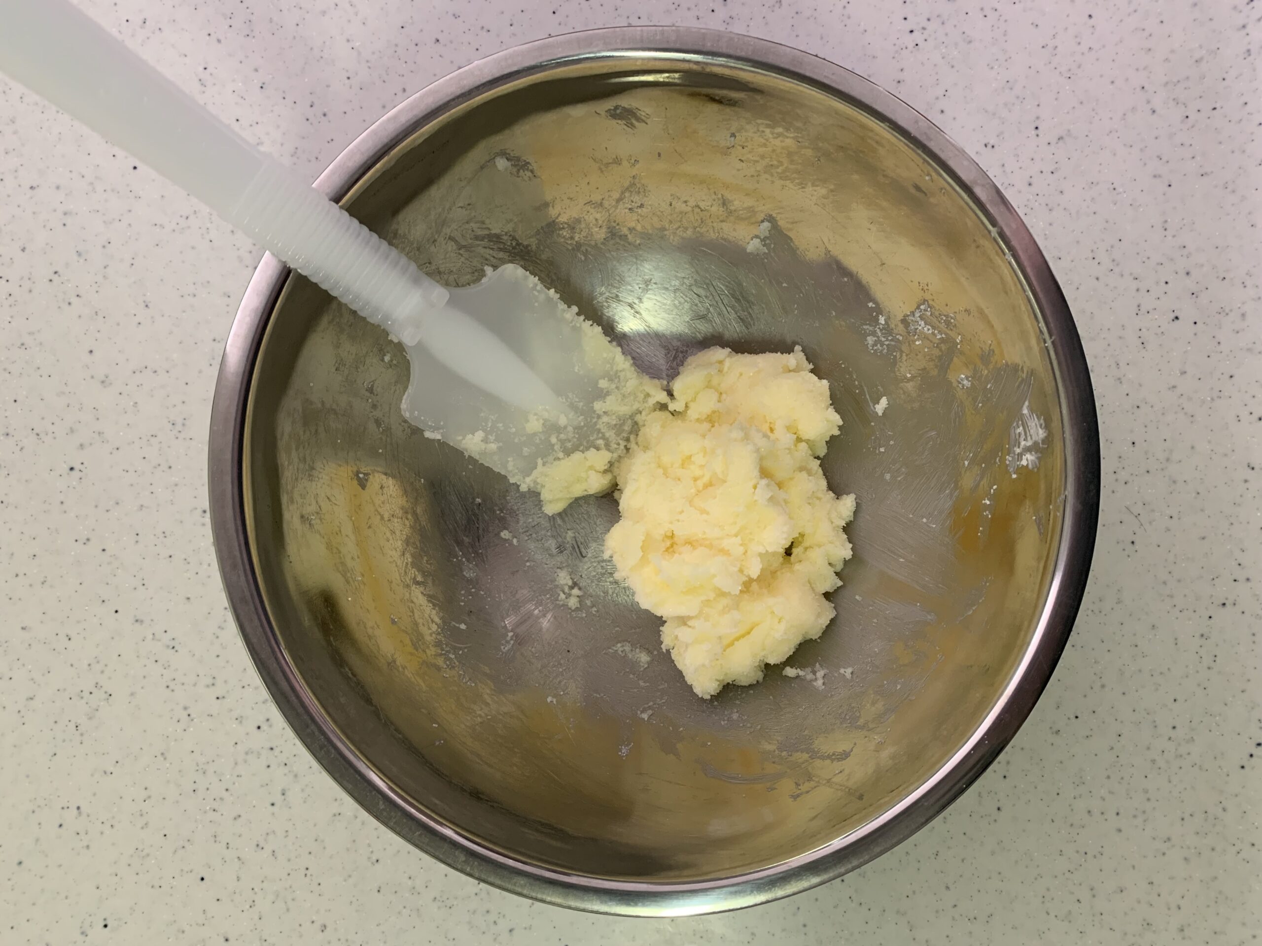 ① | ![]() バターと砂糖を混ぜる 柔らかくしたバターと砂糖をゴムベラですり混ぜる。 《ポイント》 バターは室温に戻して、指で押してすこしへこむ 状態にしておく。 ※150wで10秒きざみで温めてやわらかくする 方法もあります。 |