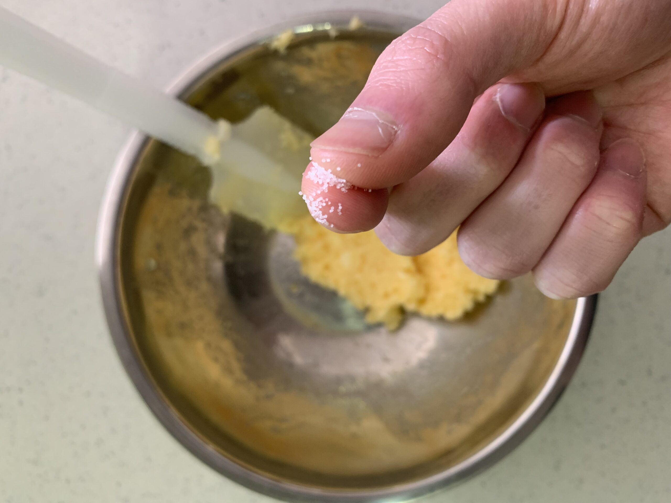③ | ![]() 塩・バニラエッセンスを加える 塩を入れて混ぜたあとに、 バニラエッセンスを加えて混ぜる。 |