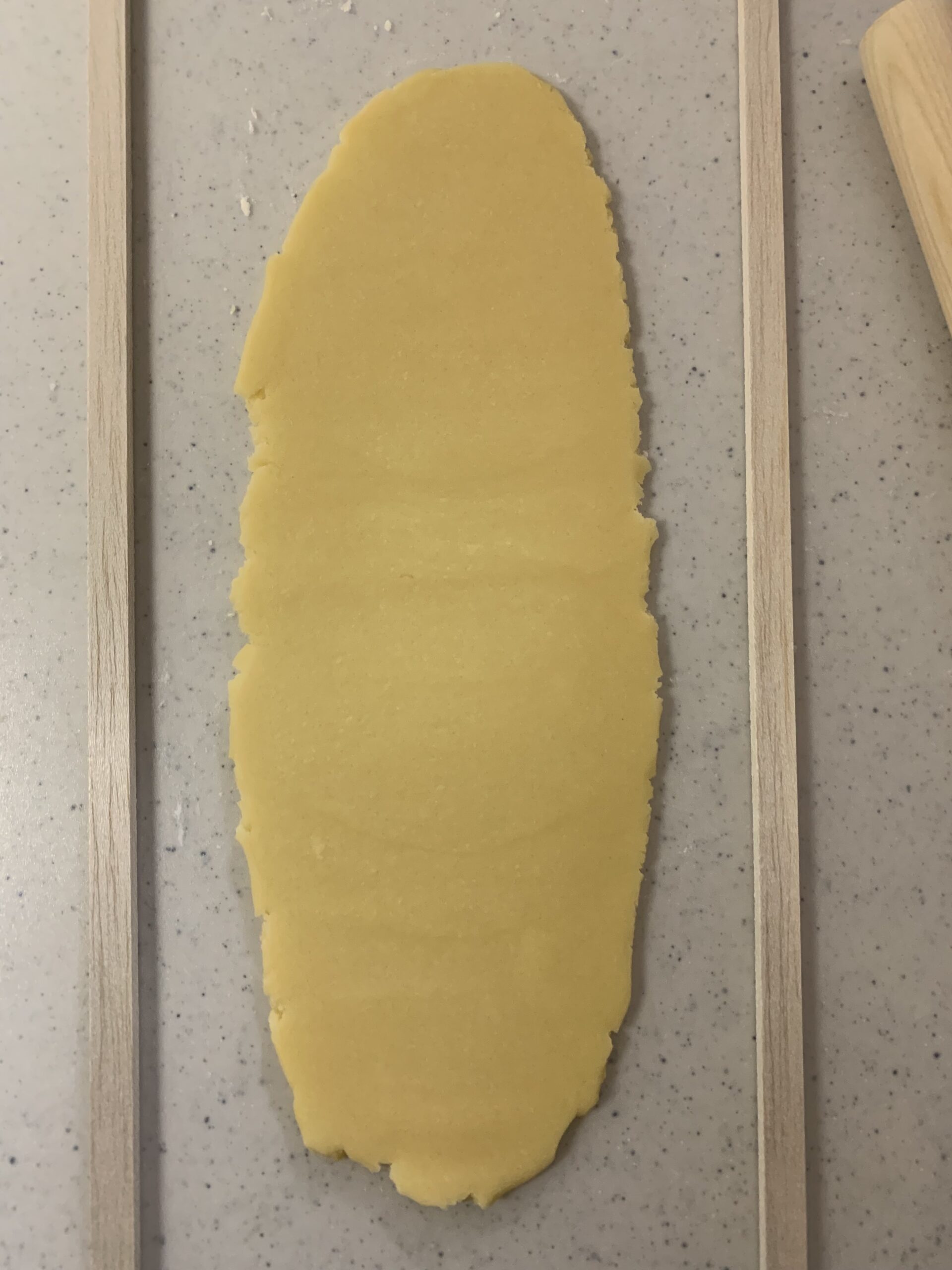 ⑦ | ![]() 生地を5mm厚に伸ばす 冷蔵庫から取り出した生地をめん棒と角材(5mm厚) を使って5mmの厚さに伸ばす。 ※角材(5mm厚)は割り箸でも代用可 《ポイント》 ・5mmに伸ばす前に、生地を半分に折って伸ばす 動作を2〜3回繰り返す。 ⇒ 冷蔵庫から出した生地は、時間の経過で生地の 中心と外側で温度差が出るので、生地全体の 温度を均一にする必要があるため。 |