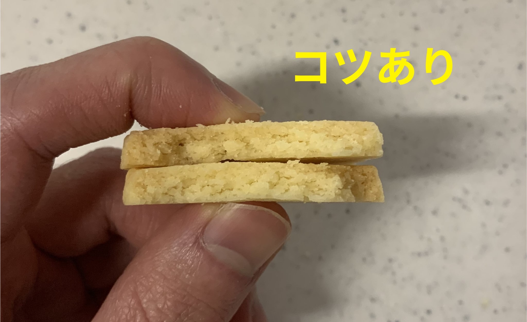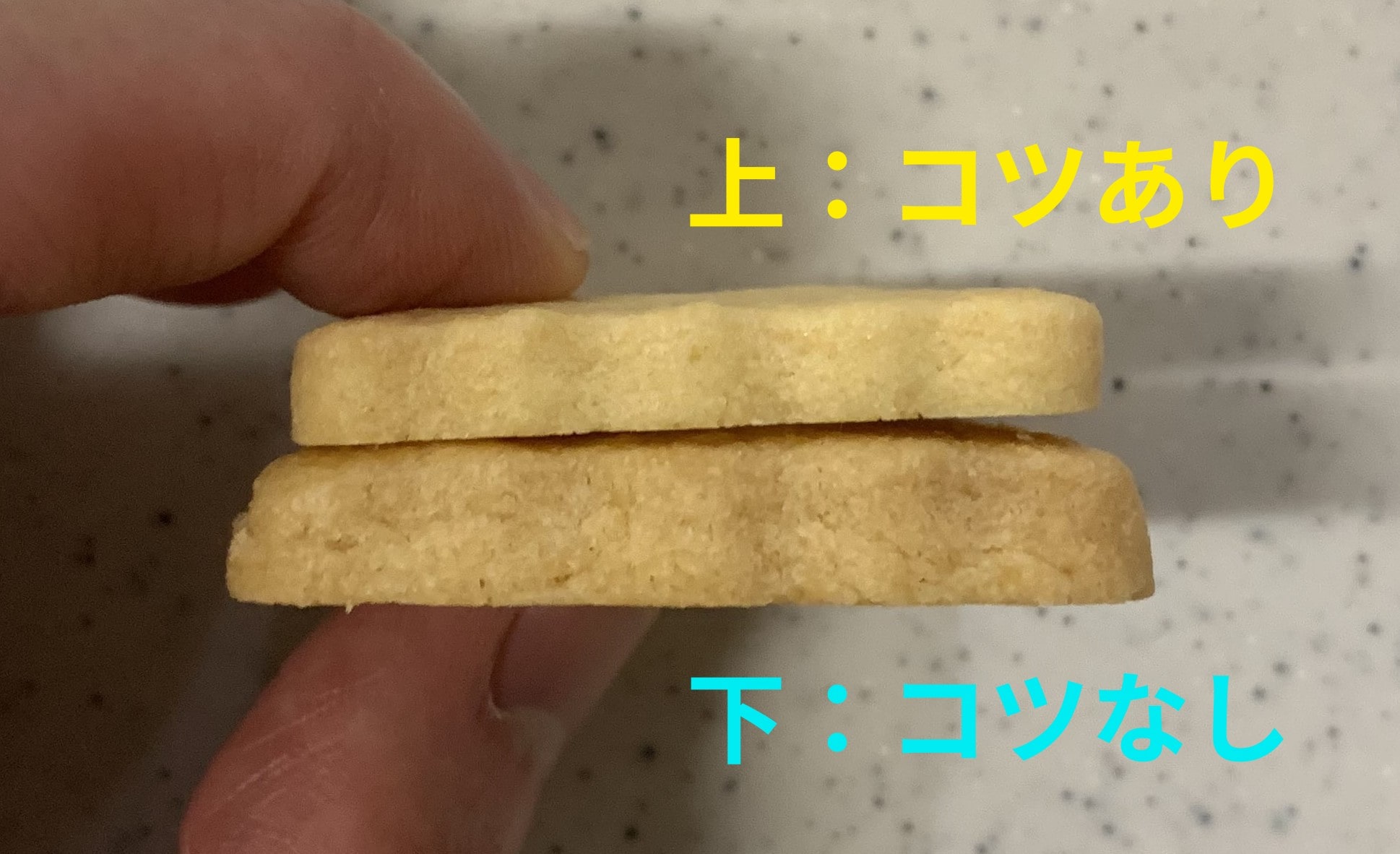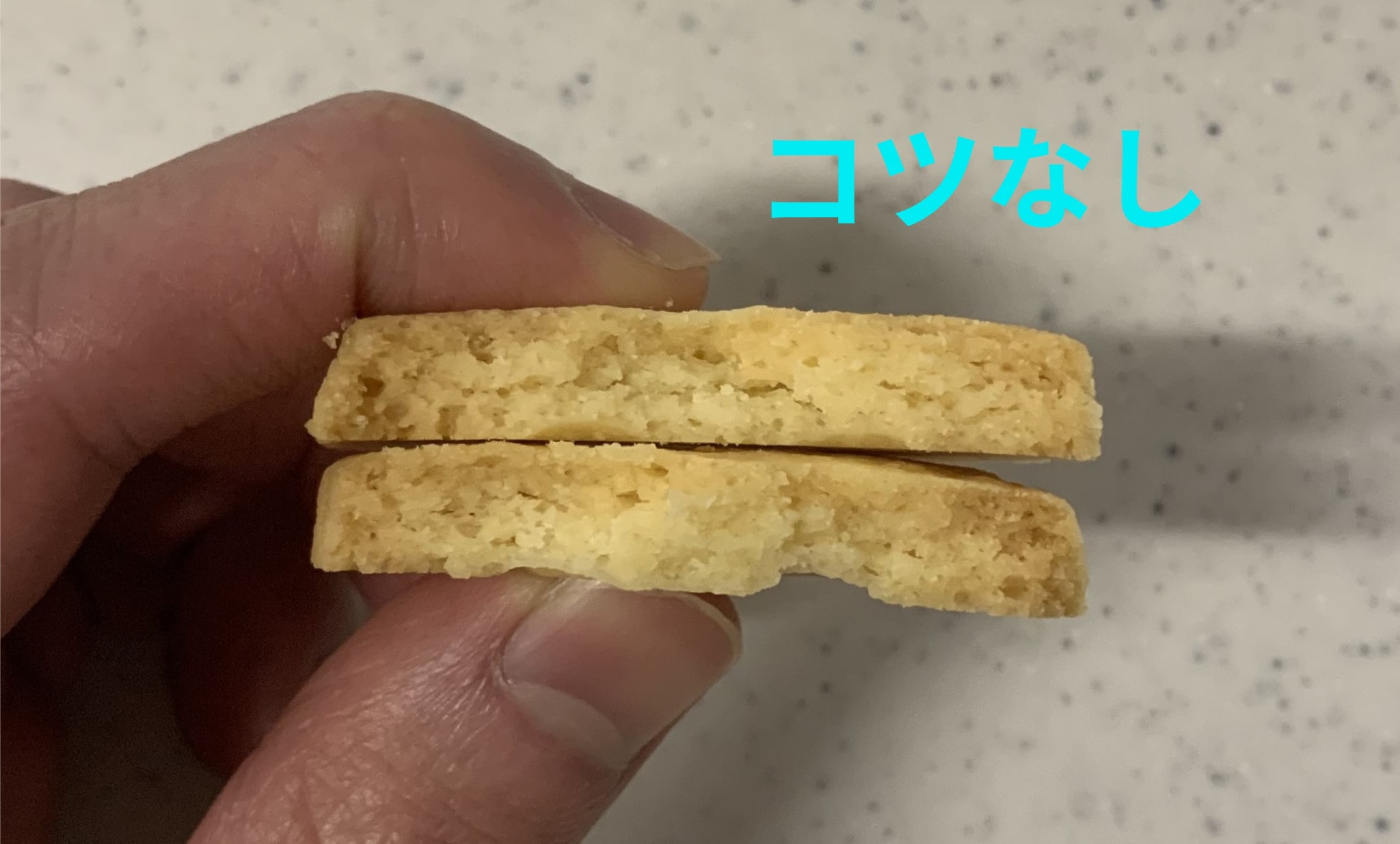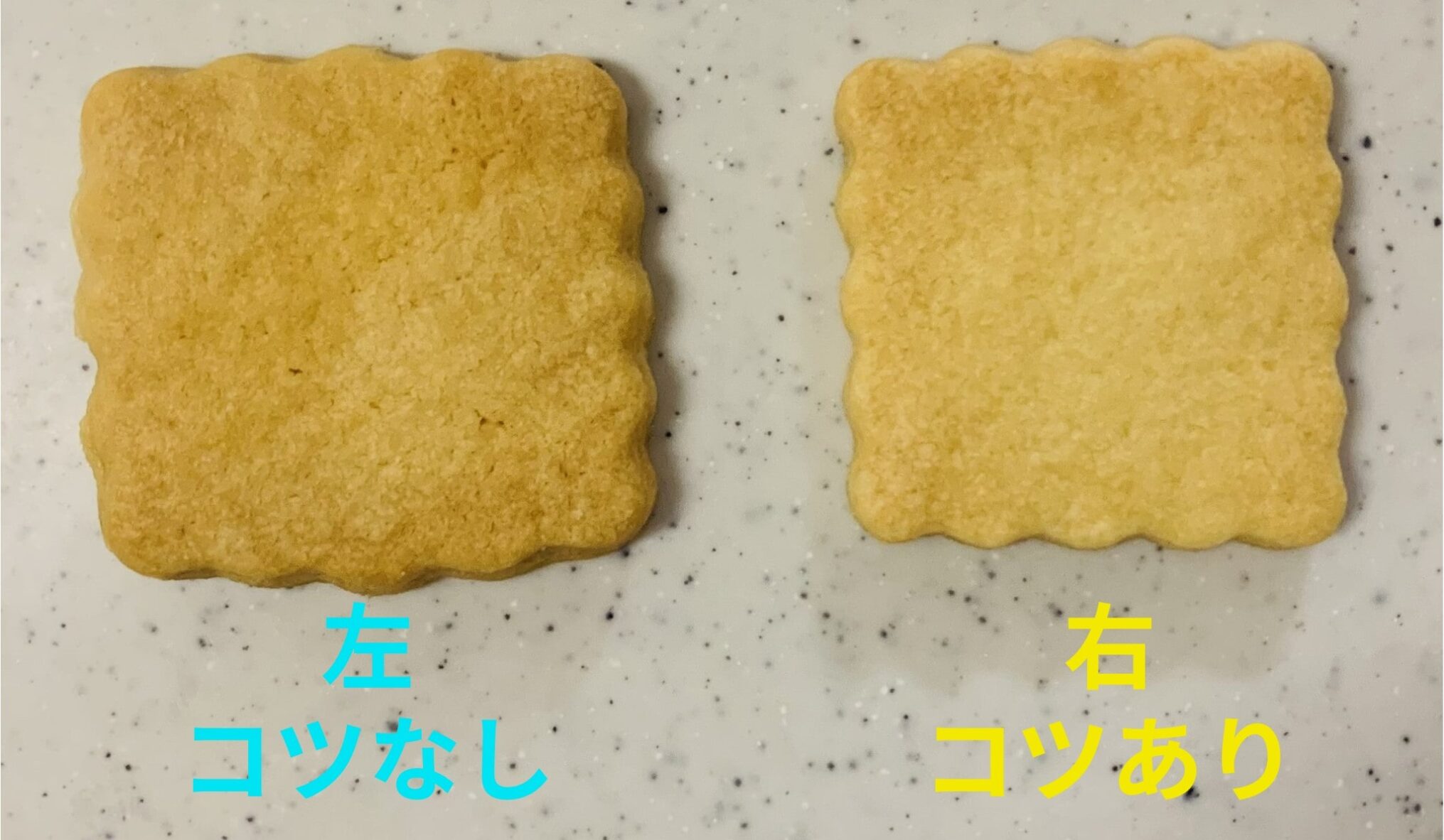 コツを使わなかったクッキーは、噛むのにすこし力が必要でバリバリとしており、コツを使ったクッキーは、サクサクと軽い食感でした。