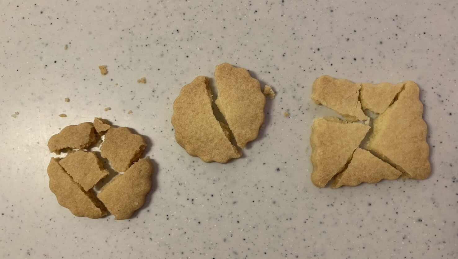 クッキーを割るときにも違いがあり、コツを使わなかったクッキーは手を使っても固く、綺麗に割るのに苦労するほどでした。